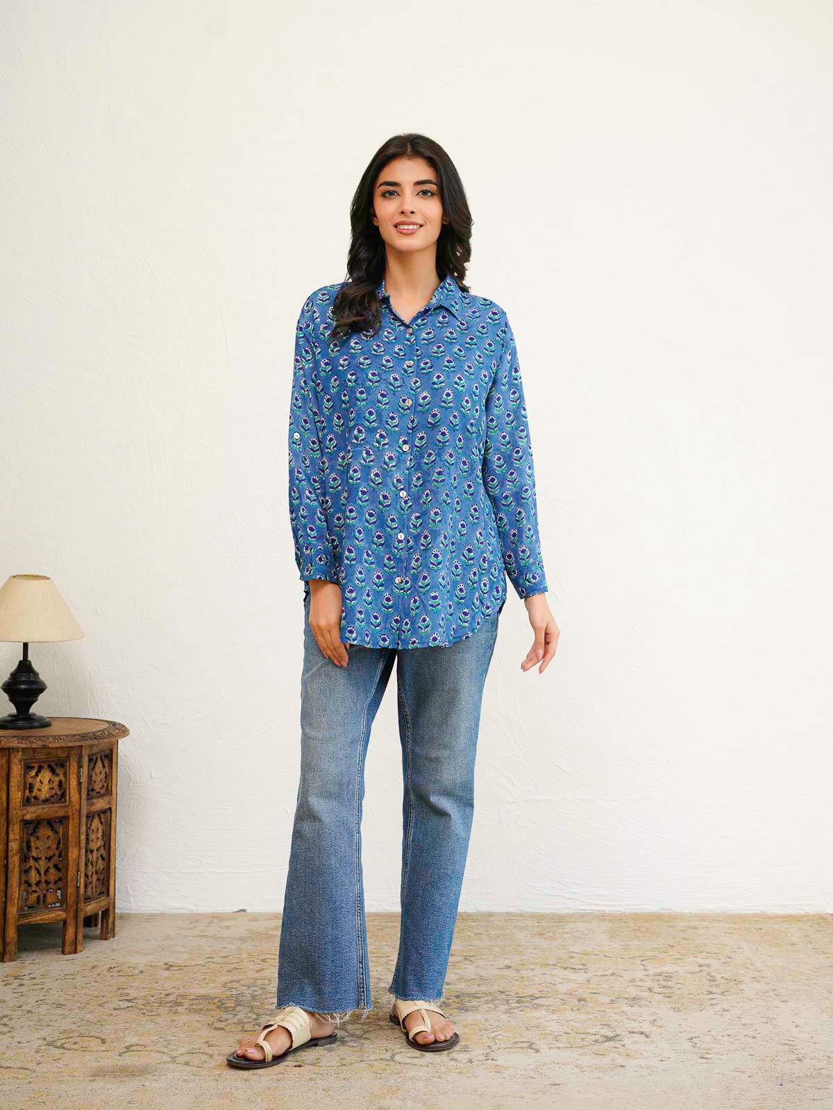 Block Printed Cotton Shirt Pant Meher Set Grey