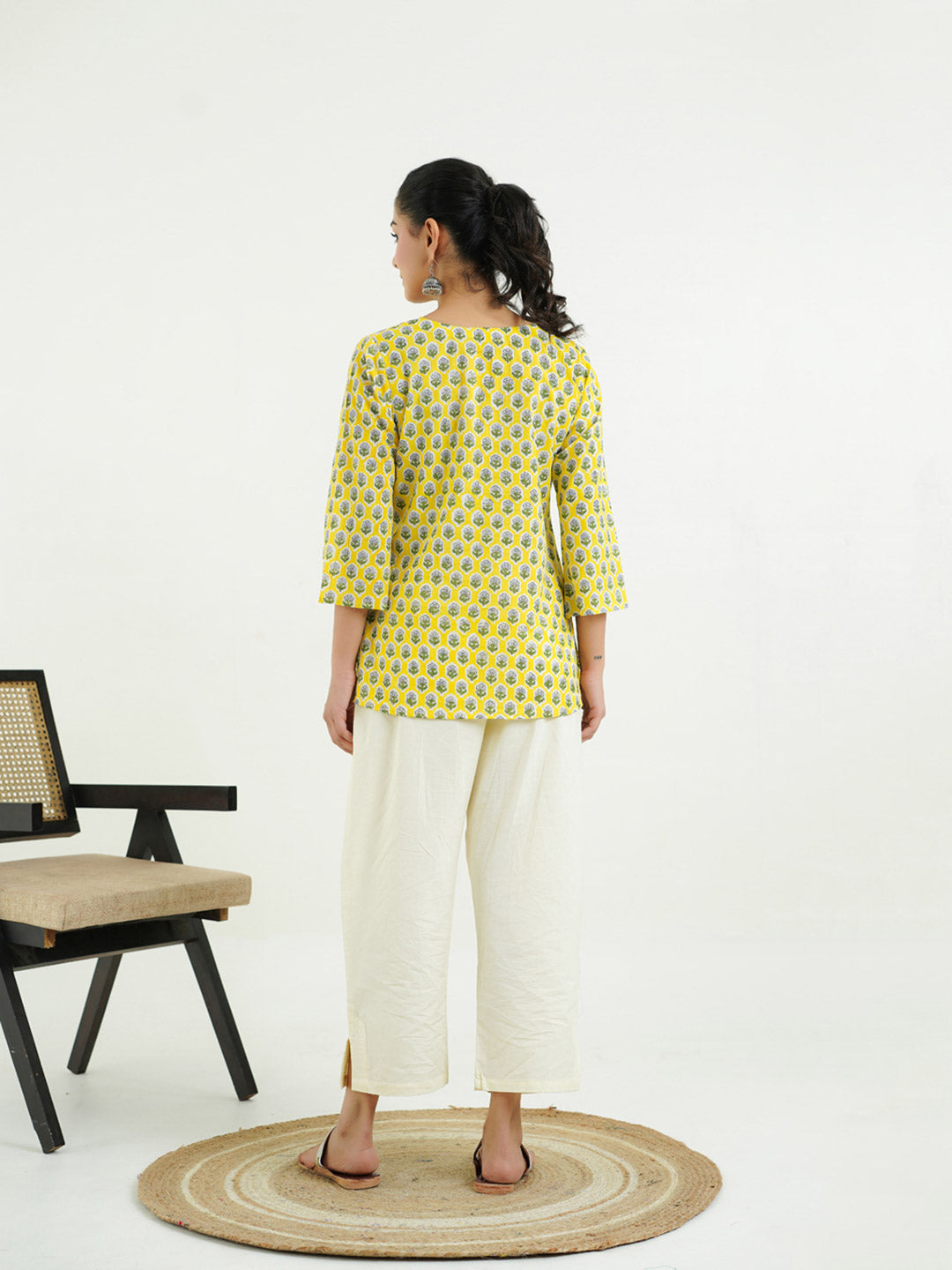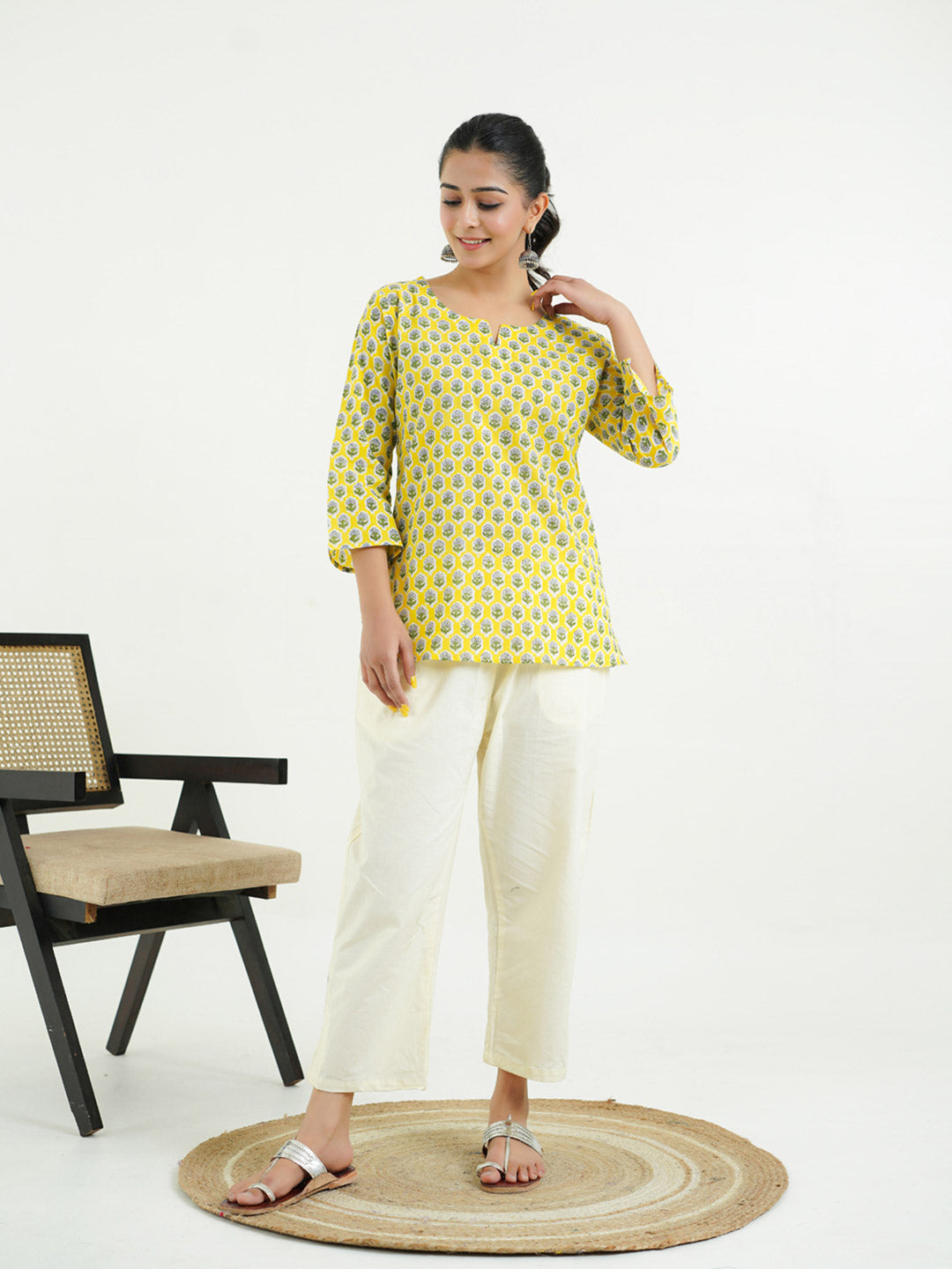 3/4th Sleeves Block Printed Cotton Top Yellow