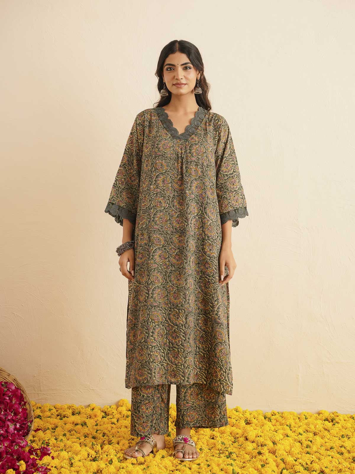 Product Description: This A-line set includes a kurta with a delicate scalloped lace on neckline and on the hem of sleeves. There is a pleat detailing below the neckline. The pants are relaxed with elastic on the waist and have a drawstring too for further adjustment in fit. The pants also have 2 side pockets. It has been created with the purpose of taking care of your curves while helping you transition easily from day to night.