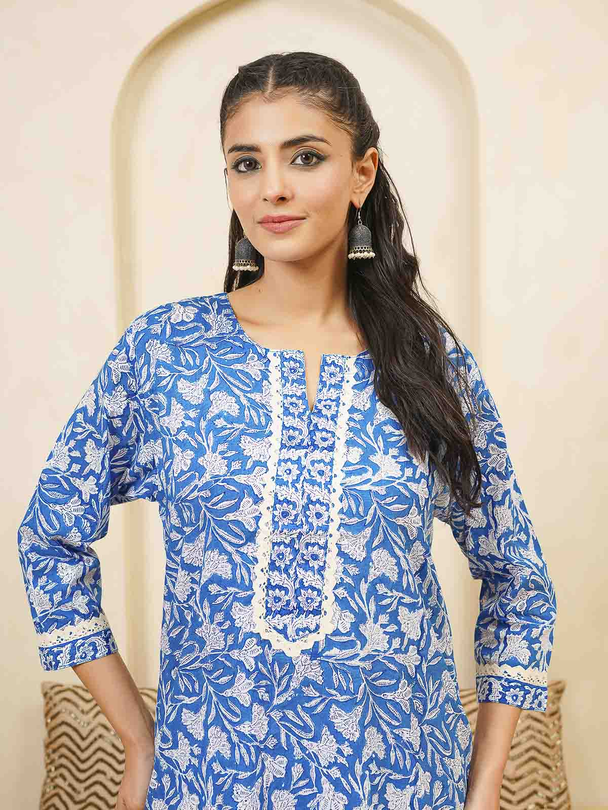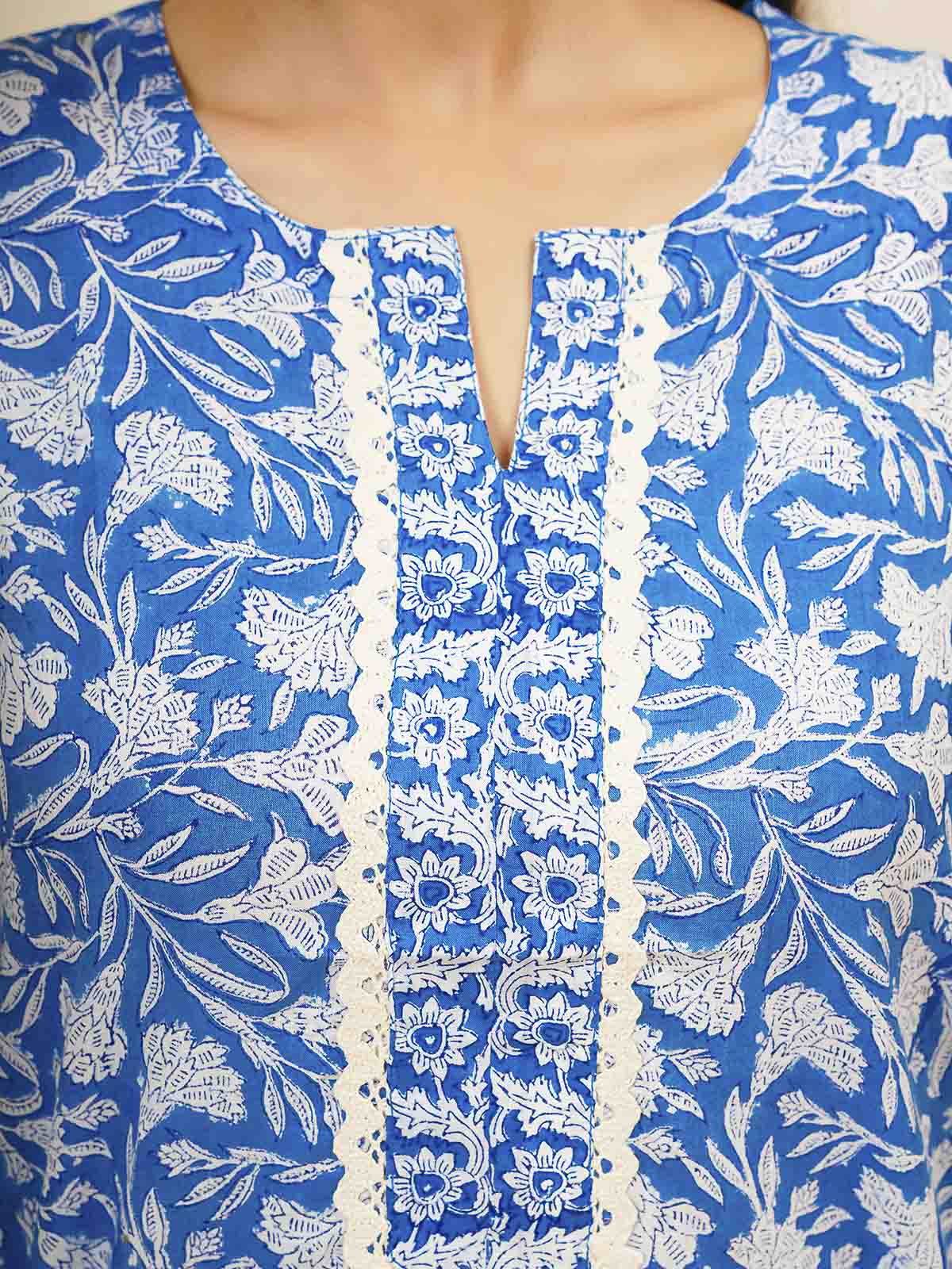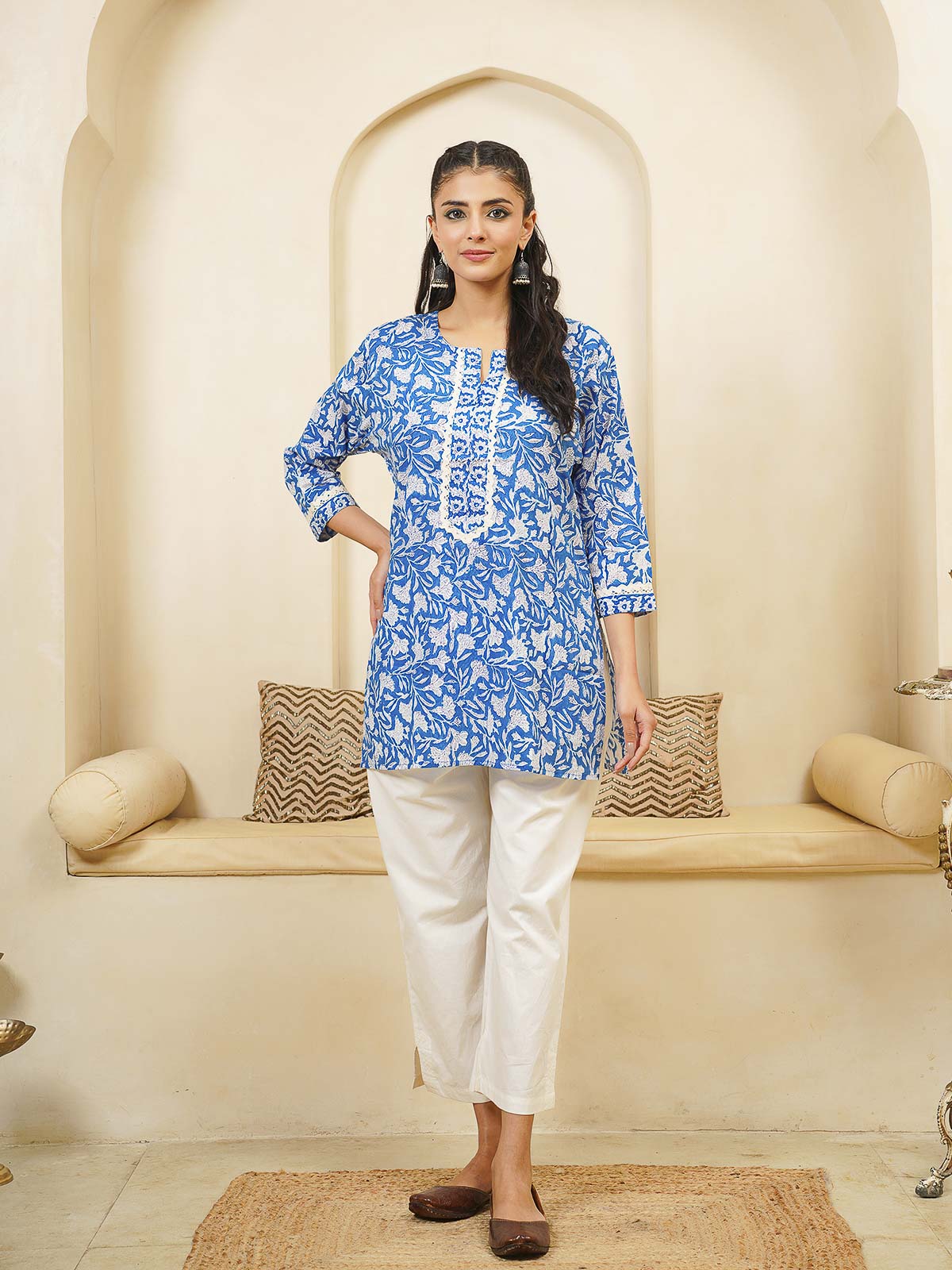 Product Description: This short kurti had a round neckline with a V. The neckline and sleeves are outlined by crochet lace.