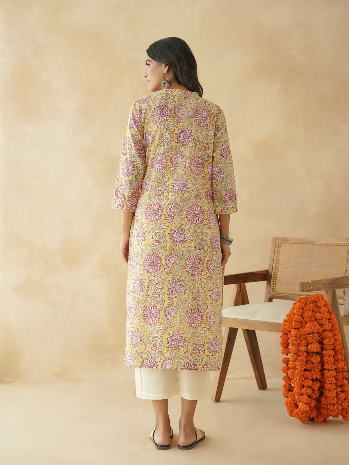 Cotton Printed Collar Neck Long Kurti For Women Yellow