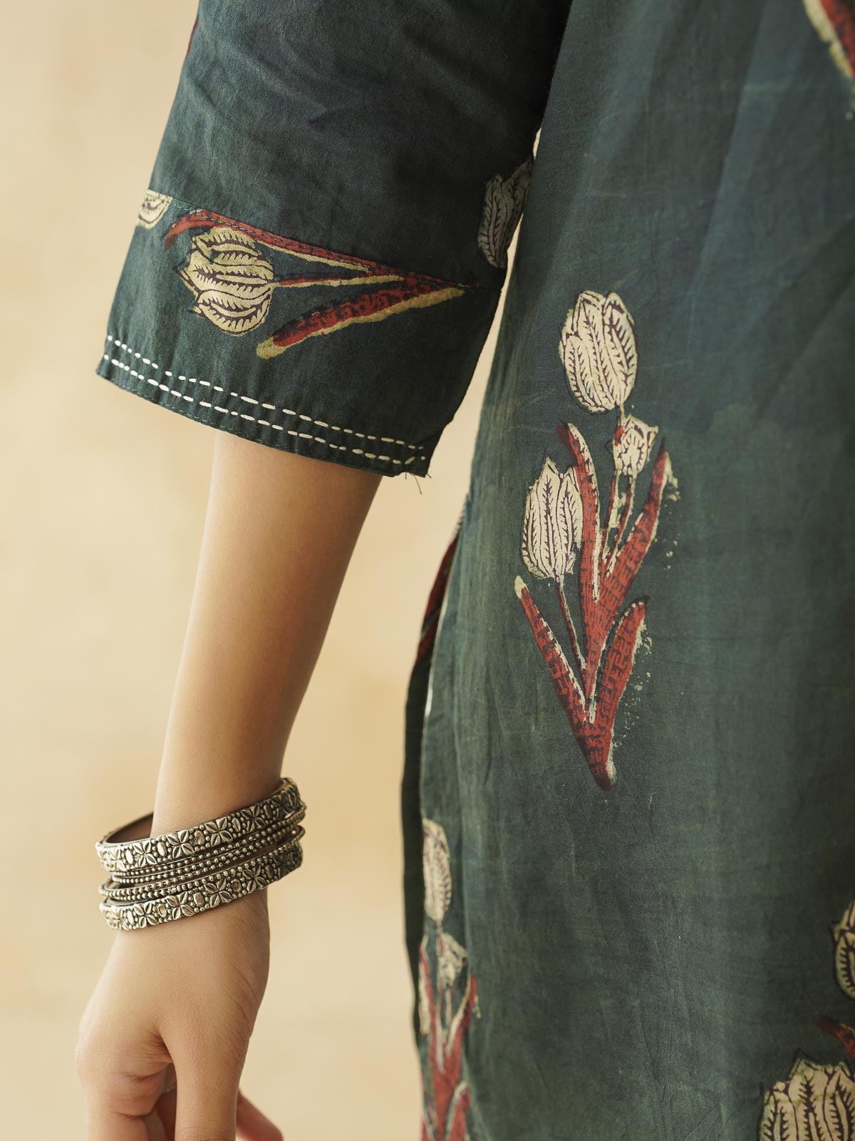 Cotton Printed Kantha Kurta Green