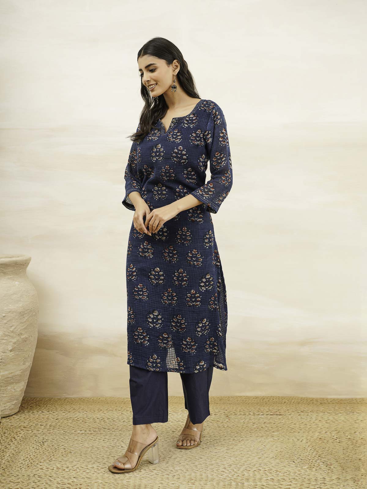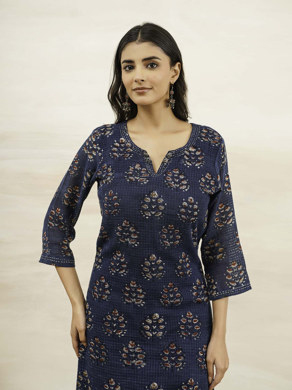 The kurta features a rounded V-neckline and three-quarter sleeves, accentuated with hand-done Kantha stitches.