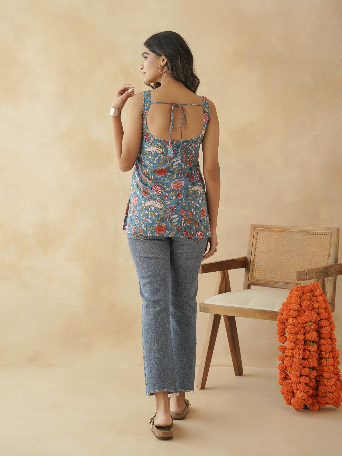 Cotton Printed Stylish Backless Tie-Up Kurti Blue Jaal