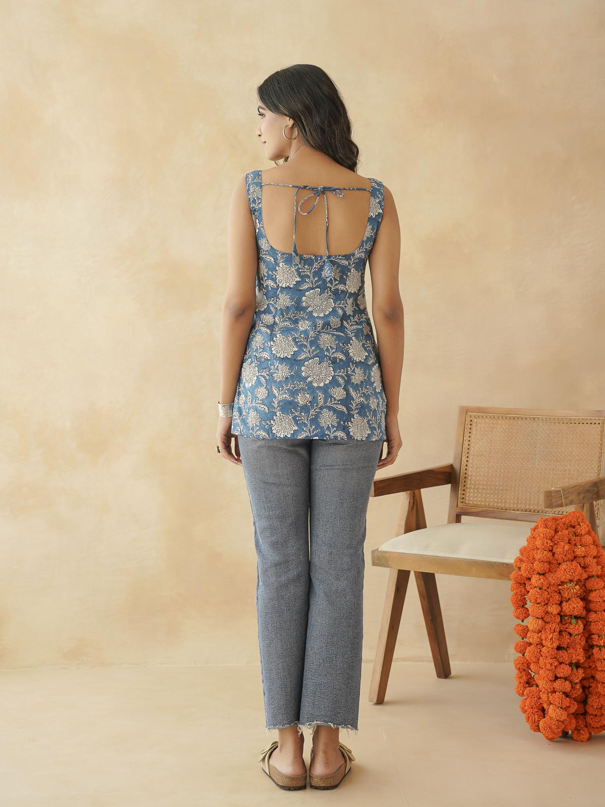 Product Description: Crafted in soft cotton, this sleeveless short kurti features a flattering round neckline and a gently flared silhouette for all-day ease. The back is finished with a delicate tie-up detail, adding a subtle touch of charm.