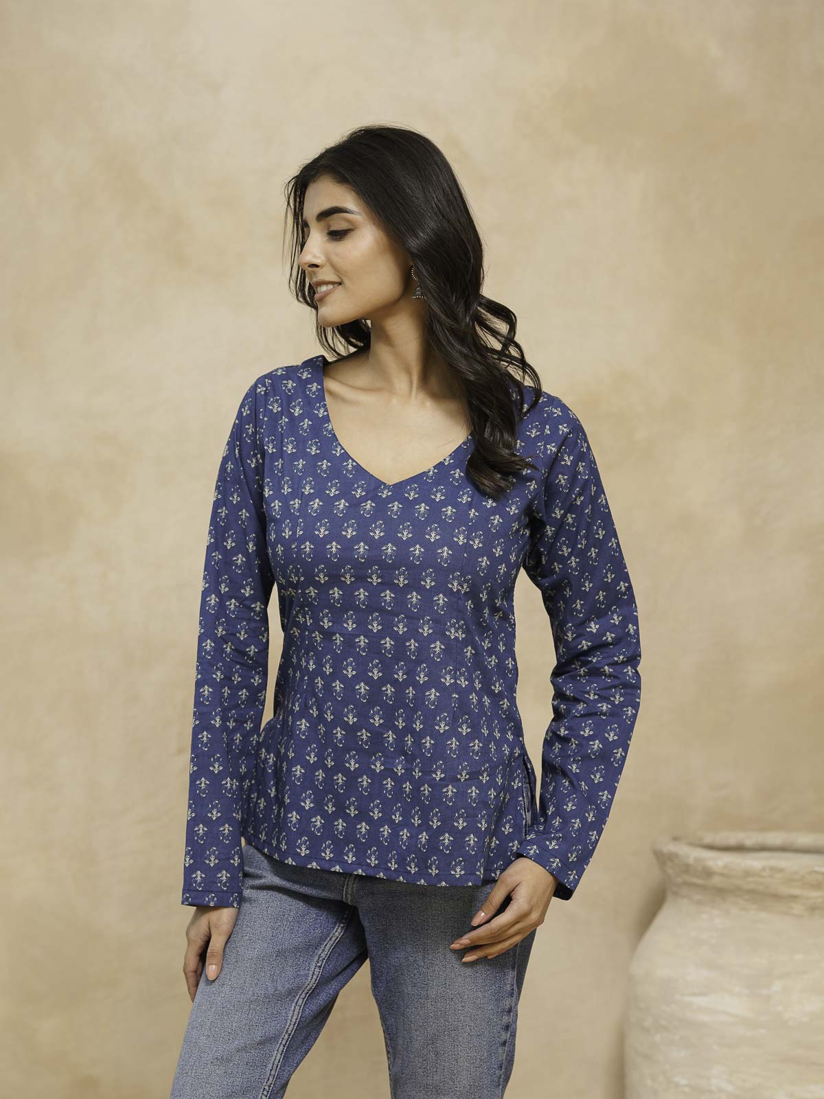 Full Sleeve Cotton Printed Classic Vee Top Blue Indigo Flower