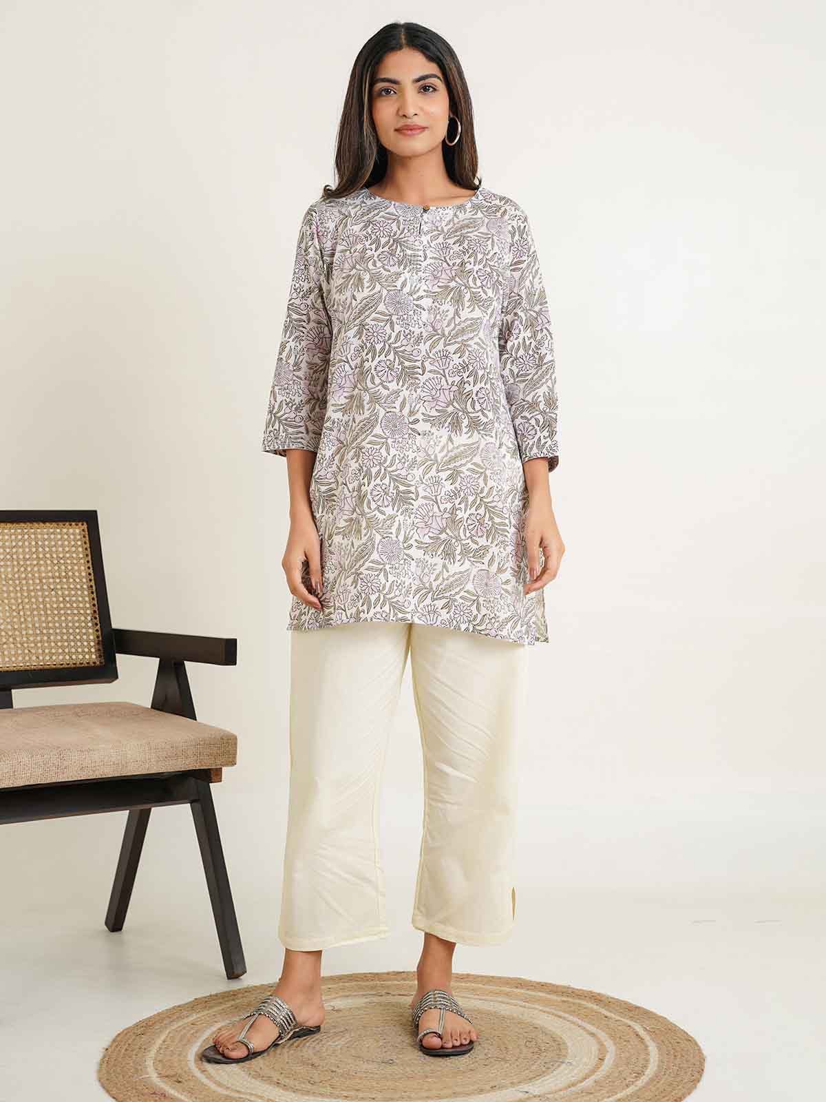 Product Description: This is a short kurti with machine stitch work done on the neckline. The sleeves are three - fourth length.