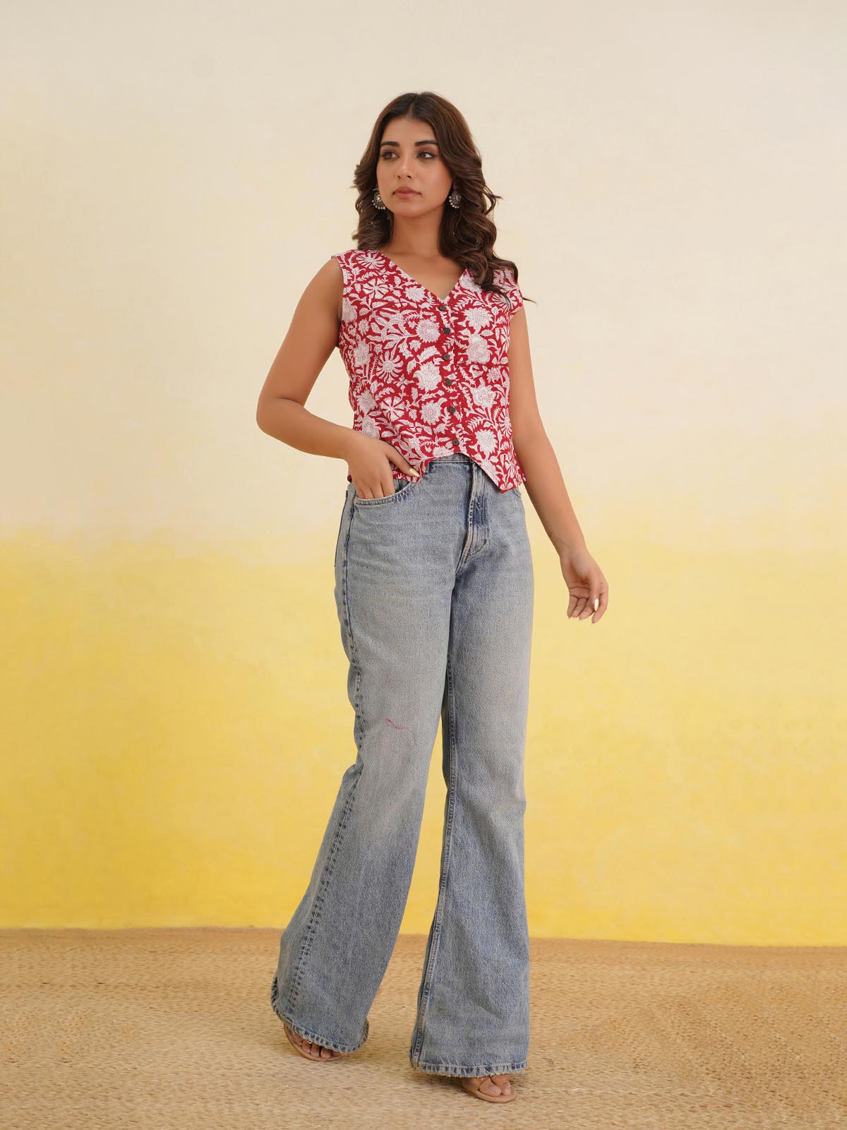 Product Description: Crafted from pure-cotton for all-day comfort, our Kothi top features a V-shaped neckline, a buttoned-up front, and a sleeveless cut for effortless styling.