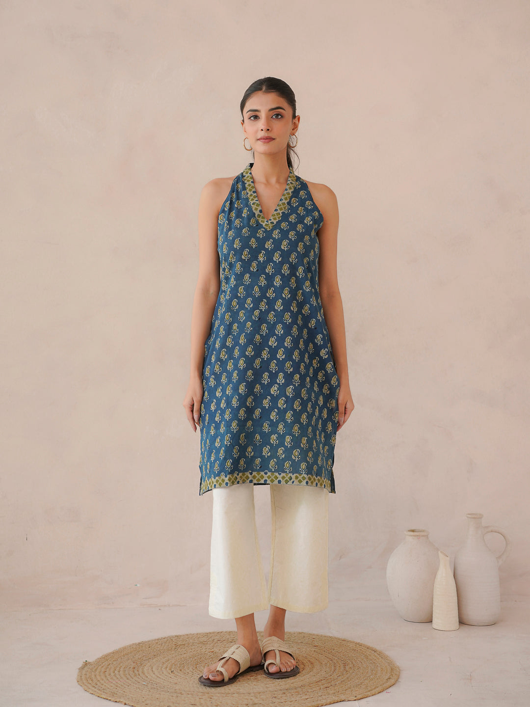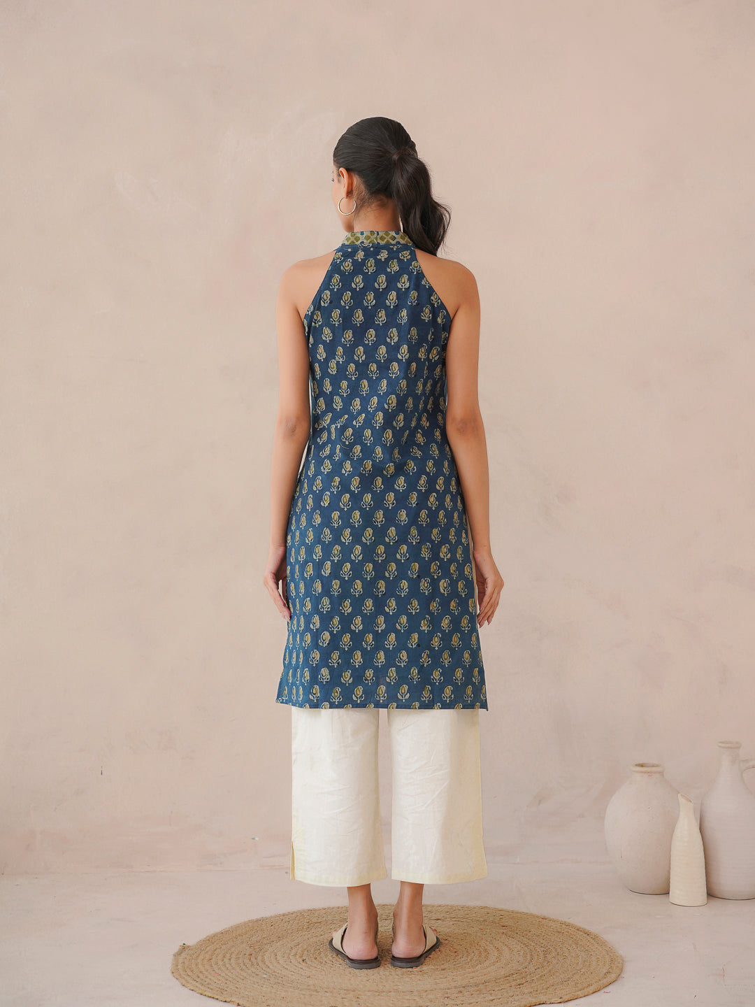 Sleeveless Cotton Halter Neck Kurti Indigo