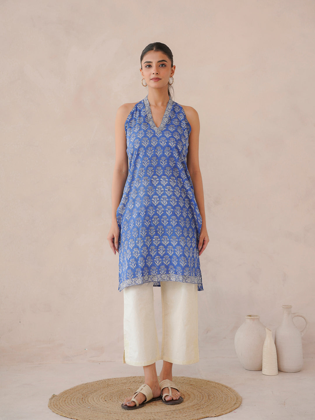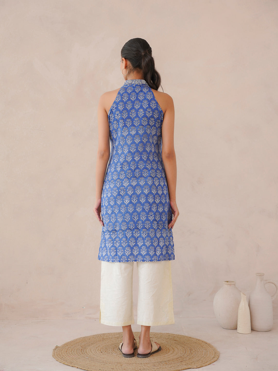 Sleeveless Cotton Halter Neck Kurti Royal Blue
