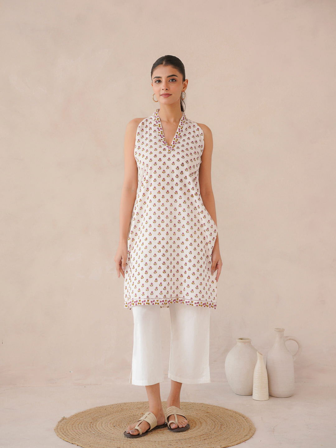 Product Description: A halter neck tiered kurti is a stylish distinctive silhouette. The halter neck style features straps that wrap around the neck, leaving the shoulders and back exposed.