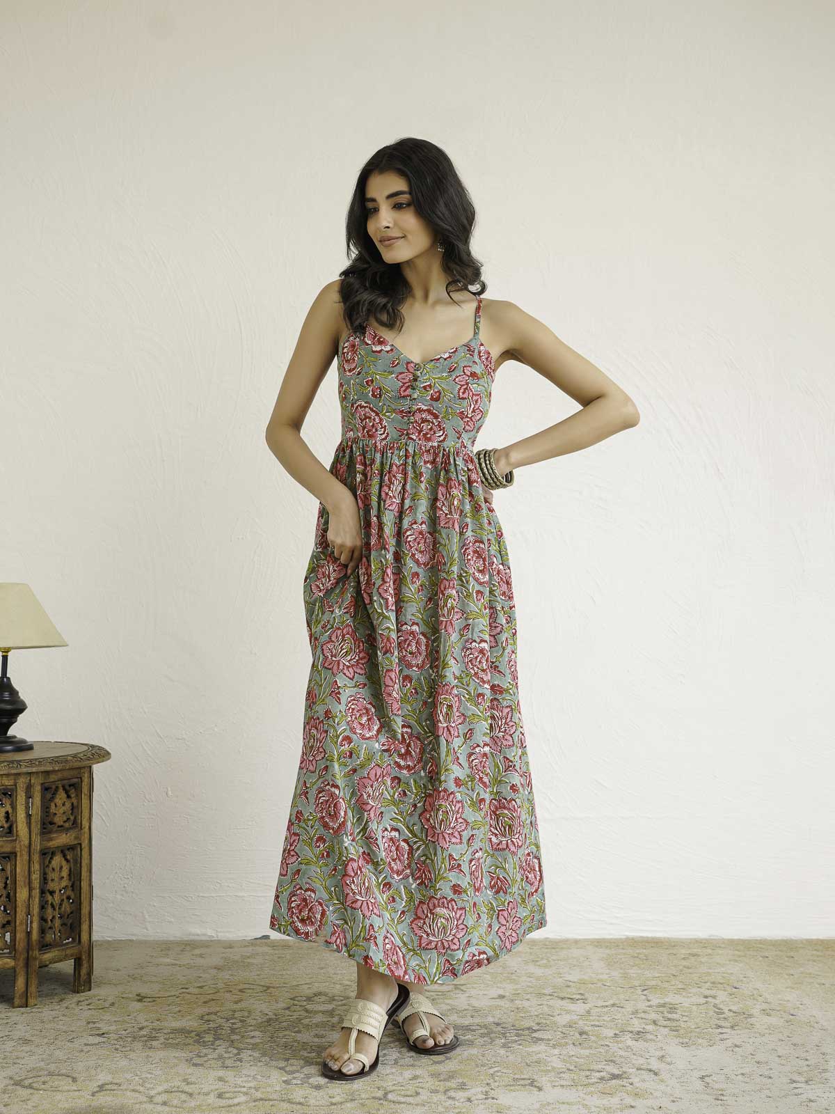Product Description: A classic gathered dress with noodle straps and cloth buttons. The gathered detailing adds volume, giving it a flattering silhouette. The delicate noodle straps offer a subtle and elegant neckline